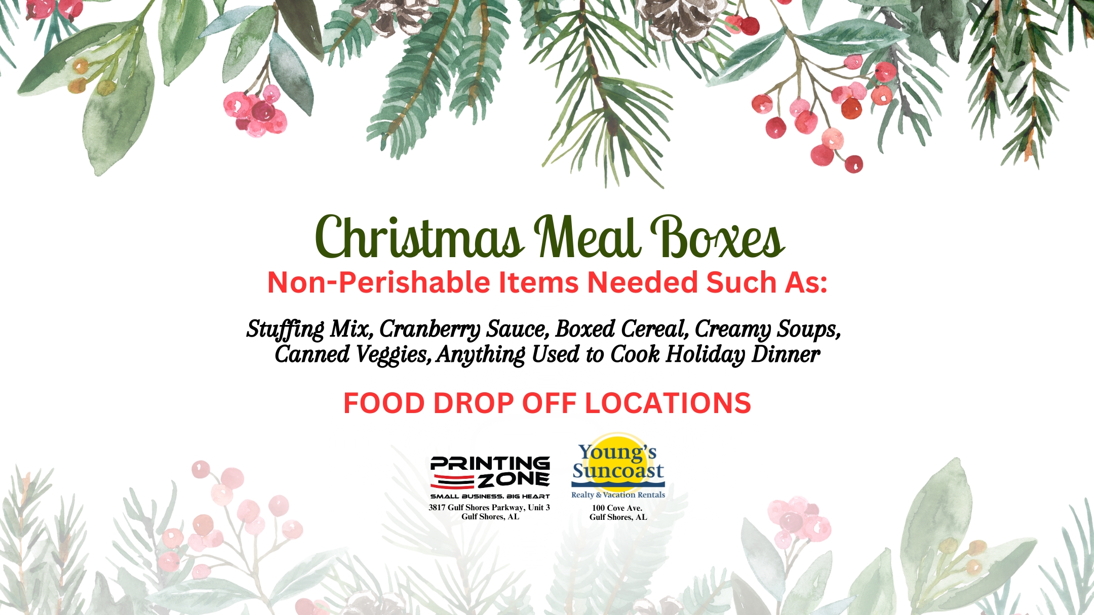 Young’s Suncoast Realty & Vacation Rentals is excited to kick off its 2025 Holiday Food Drive, supporting the Christian Service Center in Gulf Shores. Teaming up with the Sirens of the Sea Mardi Gras Krewe and Printing Zone, we’re collecting non-perishable items that help create a meaningful Holiday Dinner for local families.