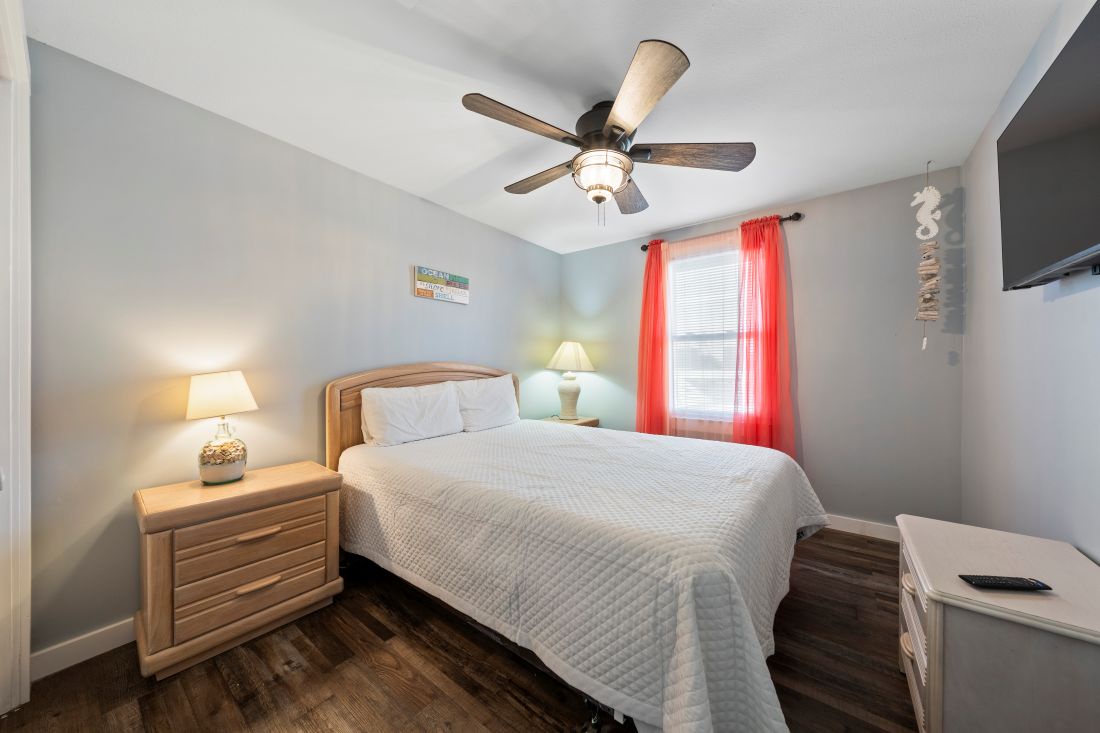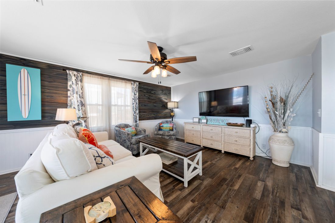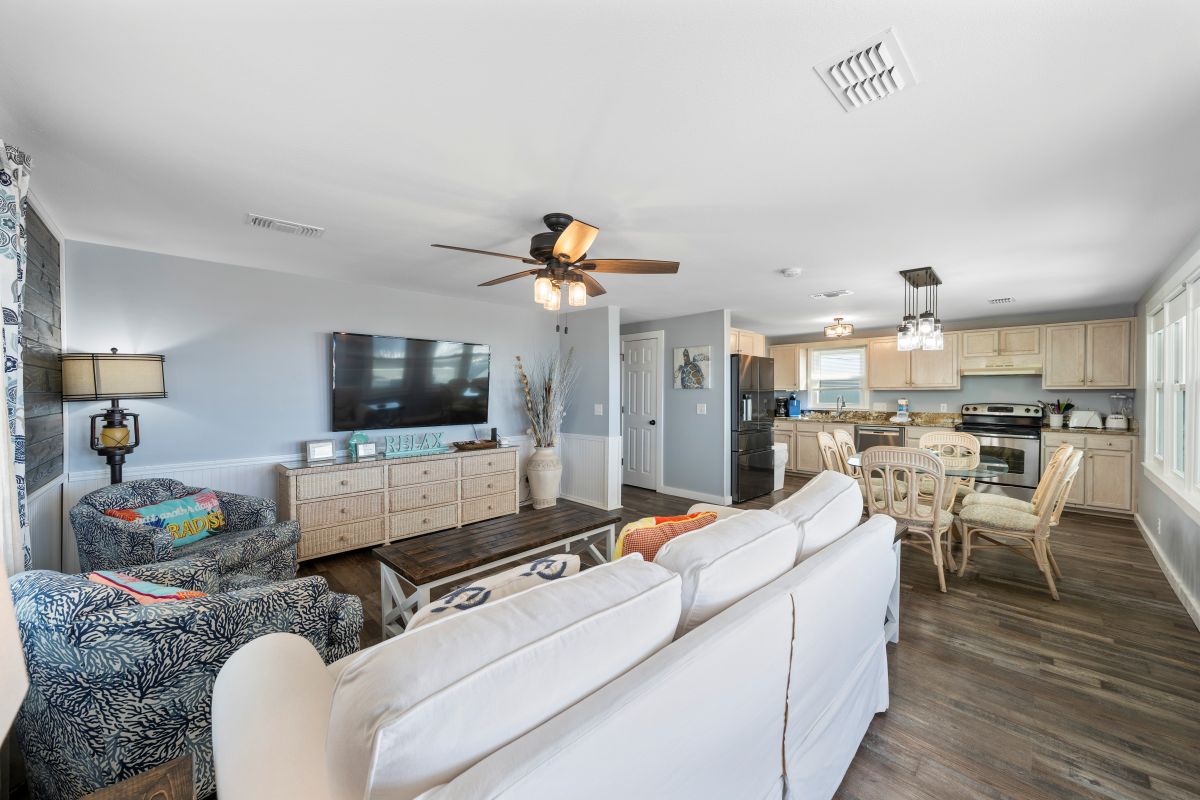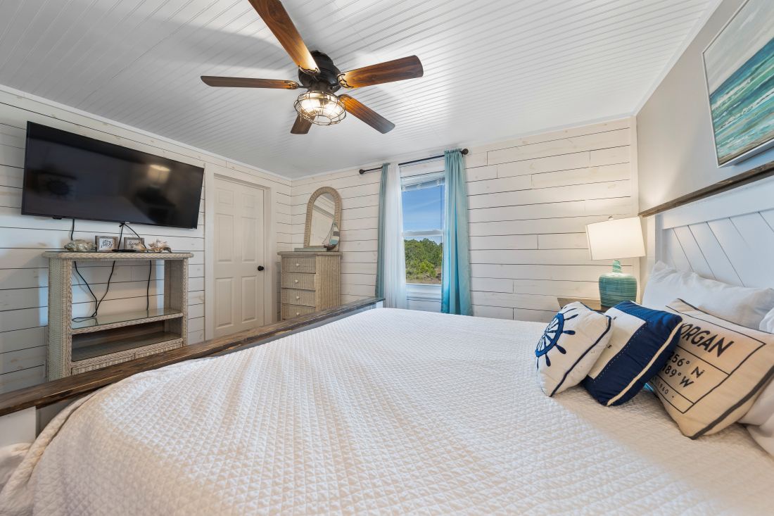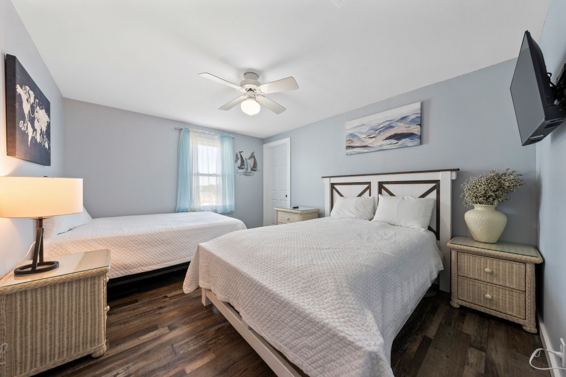 The primary bedroom, located at the back of the home, features modern coastal décor, a king bed, and a private ensuite bathroom. The second and third bedrooms continue the same coastal styling, with the second bedroom offering a comfortable queen bed. Designed with younger guests in mind, the third bedroom includes a full bed, a queen bed, and a TV. A second full bathroom is conveniently located just outside the second and third bedrooms.