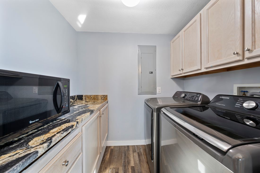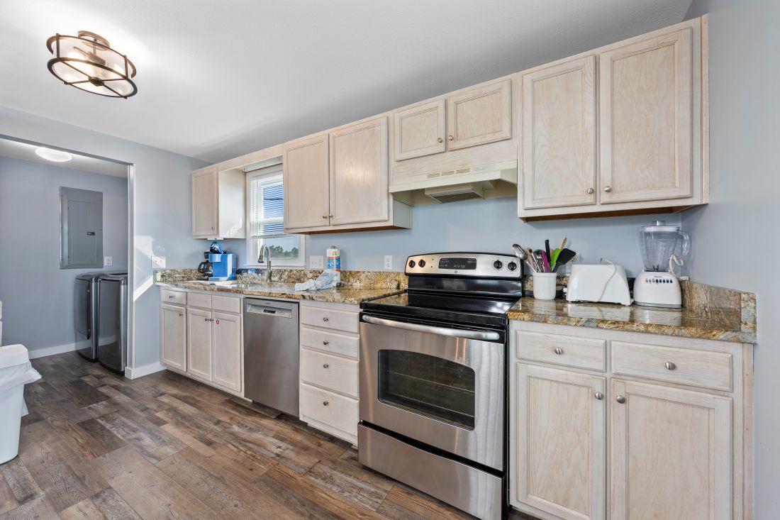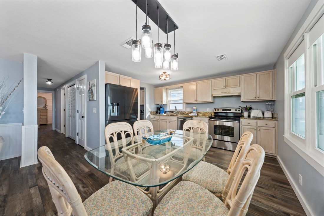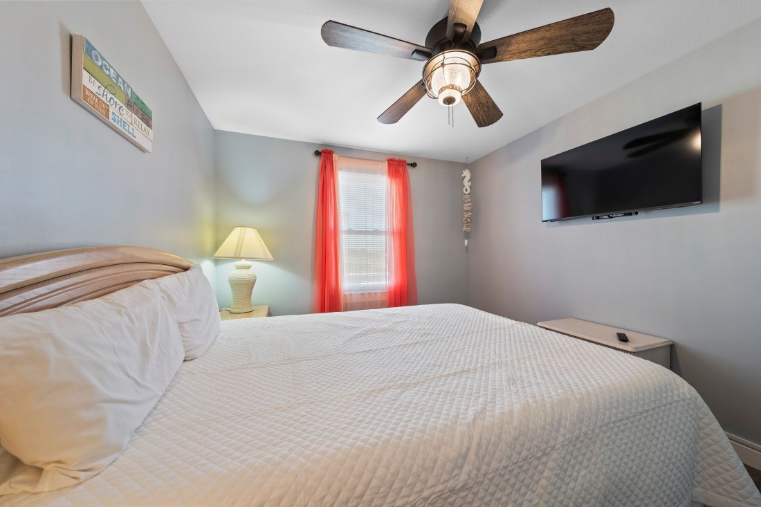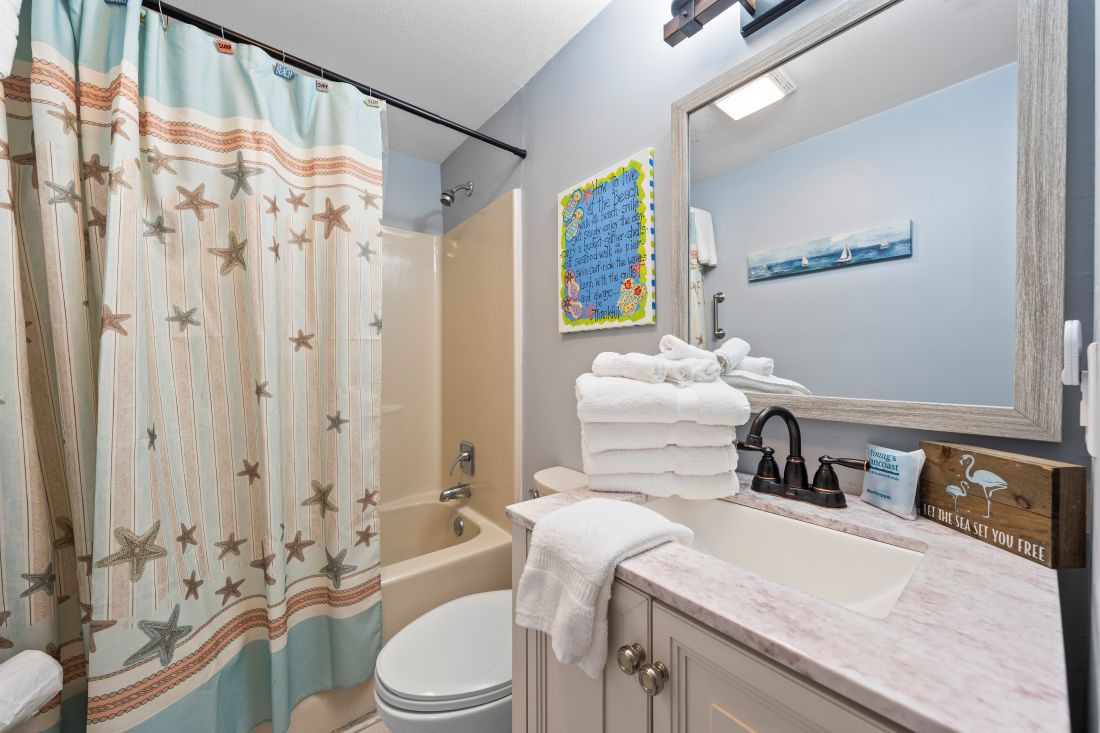 The primary bedroom, located at the back of the home, features modern coastal décor, a king bed, and a private ensuite bathroom. The second and third bedrooms continue the same coastal styling, with the second bedroom offering a comfortable queen bed. Designed with younger guests in mind, the third bedroom includes a full bed, a queen bed, and a TV. A second full bathroom is conveniently located just outside the second and third bedrooms.