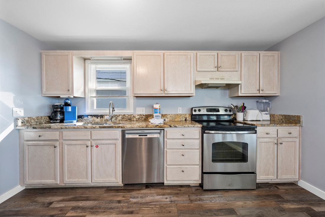 Unwind in the well-appointed living room and kitchen. The living room features a smart TV for entertainment and offers direct access to the outdoor deck. The kitchen boasts essential amenities, including a refrigerator, microwave, dishwasher, stove, and oven. Enjoy a cup of coffee with a coffee maker. Central air conditioning and heating provide year-round comfort. The dining area includes a table that comfortably seats six.