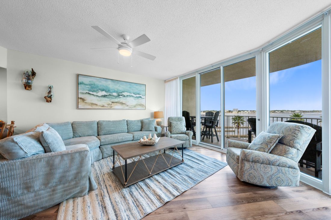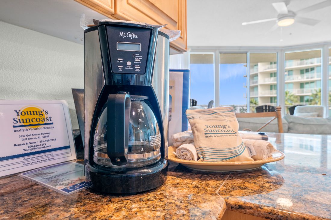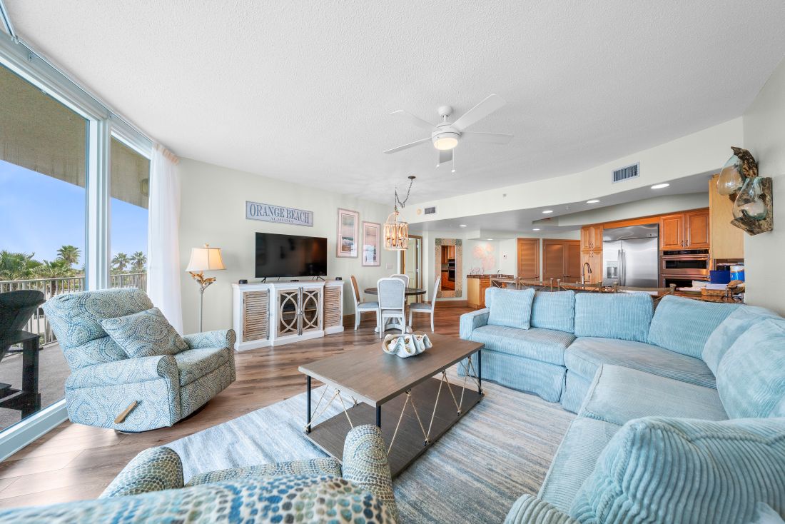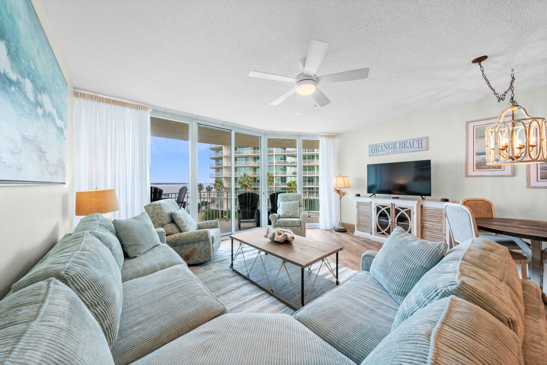 Escape to Caribe 308B. This 2-bedroom 2-bathroom vacation rental is in one of Orange Beach's most desirable resorts. The living room is surrounded by floor to ceiling windows which overlook the back bay and leads to a large private balcony with comfortable balcony furniture to enjoy sunsets. The modern fully equipped kitchen has everything you need to prepare a meal for the family to enjoy.