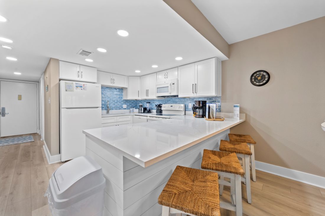 The living room features soft coastal décor that brings the beach vibes indoors, creating a calm and inviting space to unwind. Floor-to-ceiling windows showcase stunning views of the sparkling Gulf of Mexico and open to your private Gulf-front balcony. Relax with a movie on the flat-screen TV or enjoy the sea breeze just steps away. The fully equipped, updated kitchen has everything you need to prepare a classic Southern seafood meal, with seating for four at the dining table and four barstools at the kitchen counter. For added convenience, the unit also includes a full-size washer and dryer.