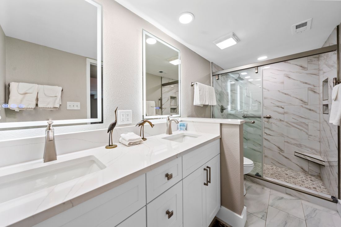 The spacious primary bedroom features a king-size bed, private en-suite bathroom with his and hers sinks and a walk-in shower, plus private access to the Gulf-facing balcony—perfect for enjoying morning coffee with a view. The second bedroom offers a comfortable queen bed, while the third bedroom is ideal for kids or extra guests with two twin beds. A shared guest bathroom includes a tub/shower combo, providing convenience and comfort for everyone.