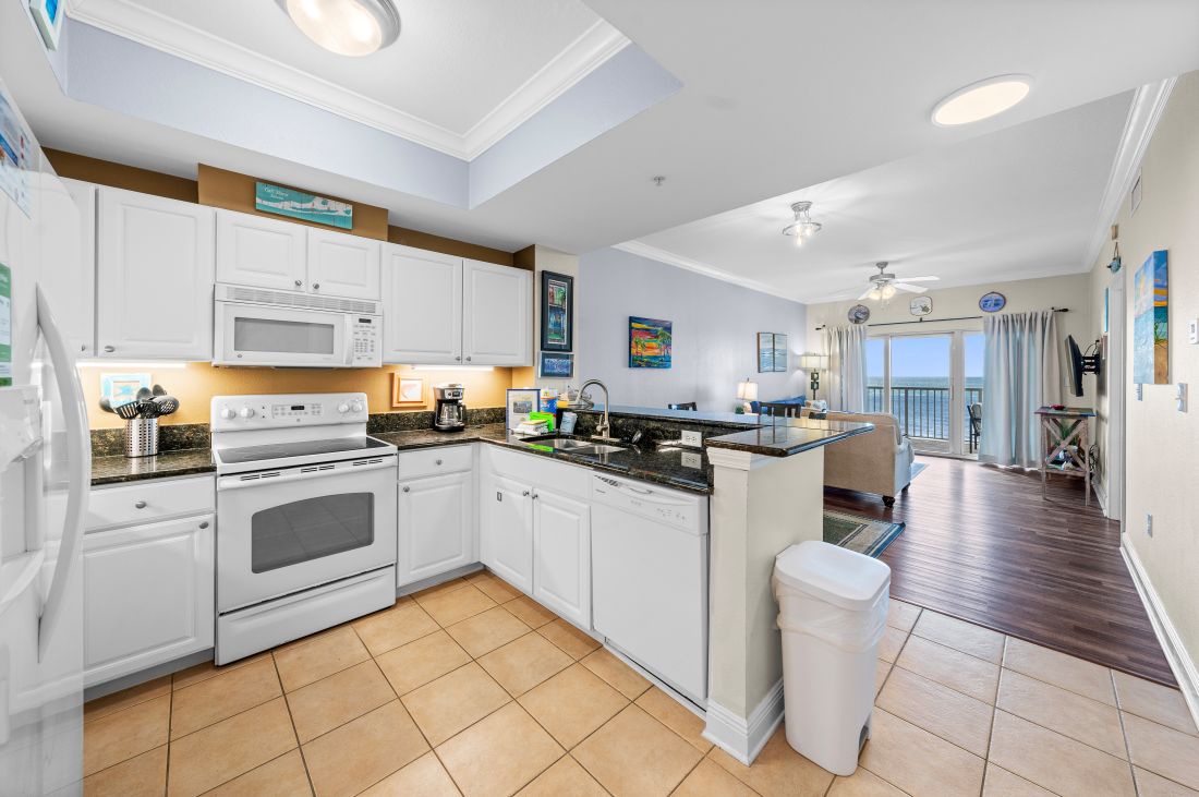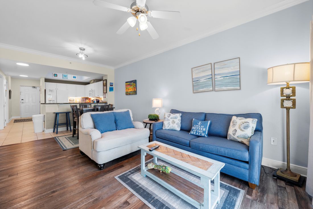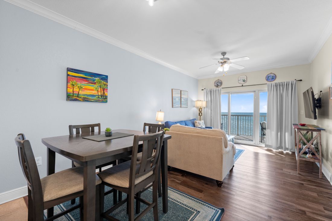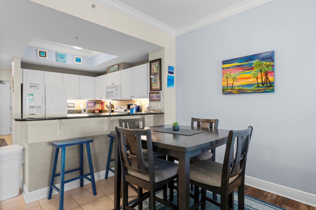 The living room in this 2-bedroom 2-bathroom condo brings all the beach vibes with its magnificent view from the private balcony. The open floor plan allows interaction while preparing family meals in the fully equipped New Orleans style kitchen. There is seating for 4 at the dining table and 2 people at the breakfast bar.