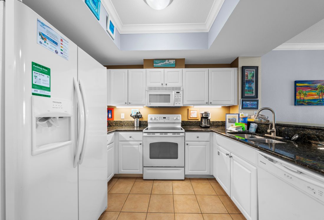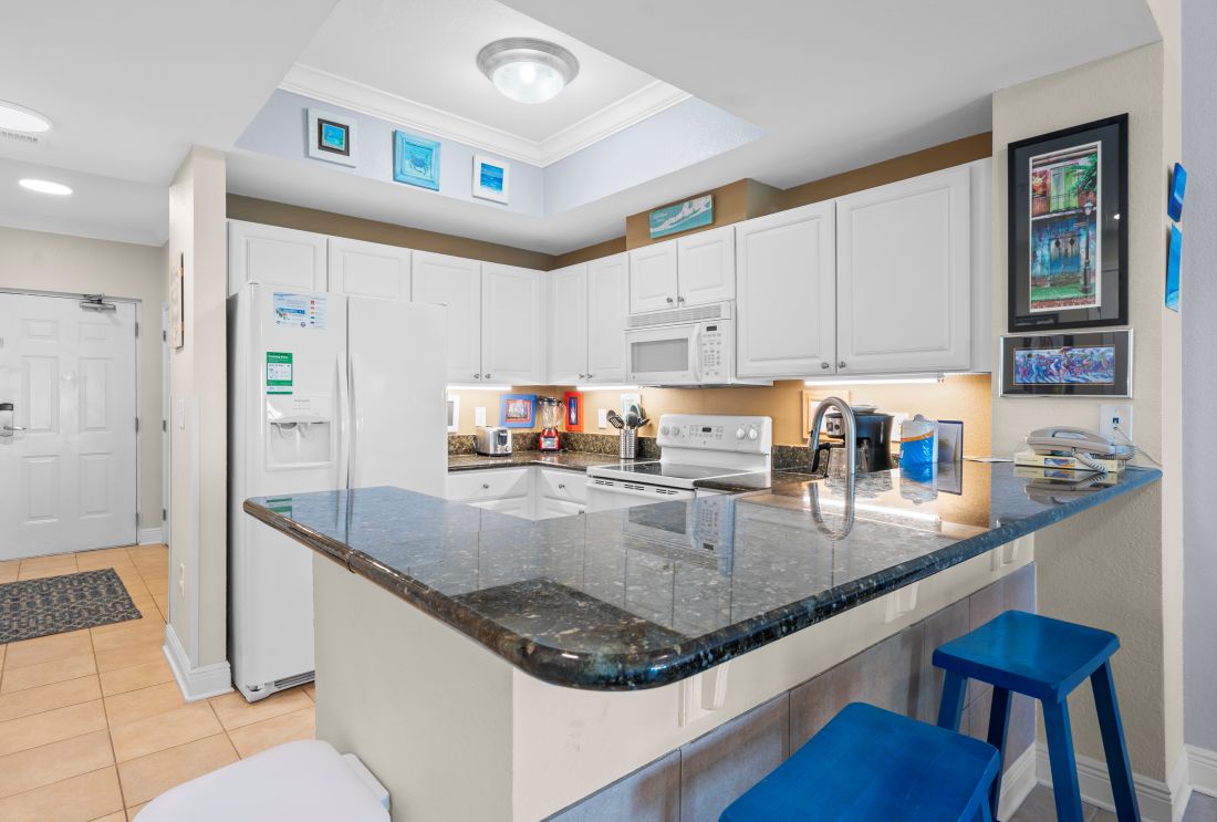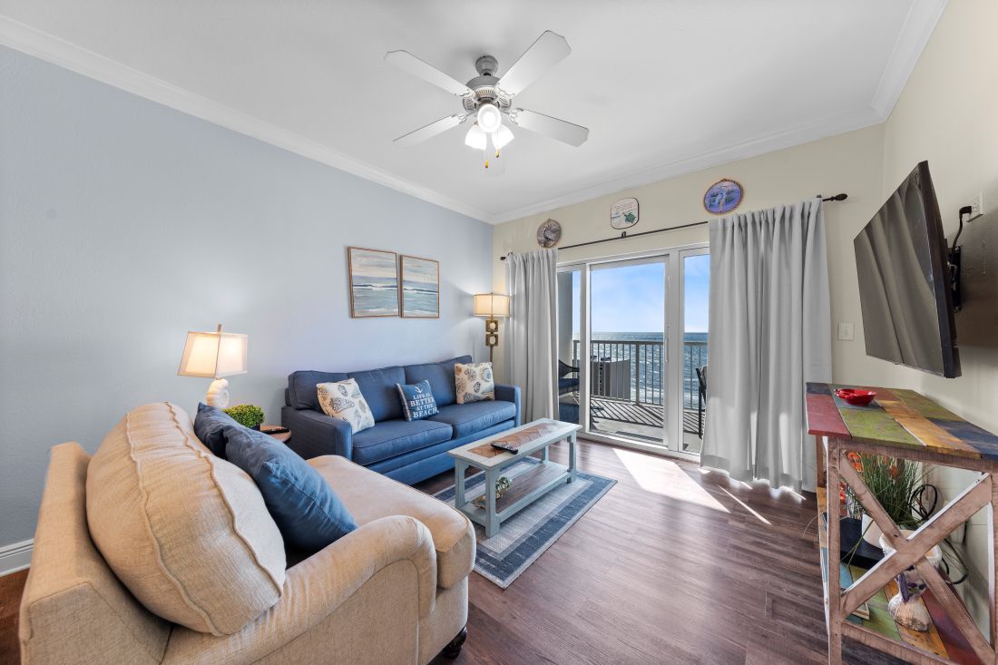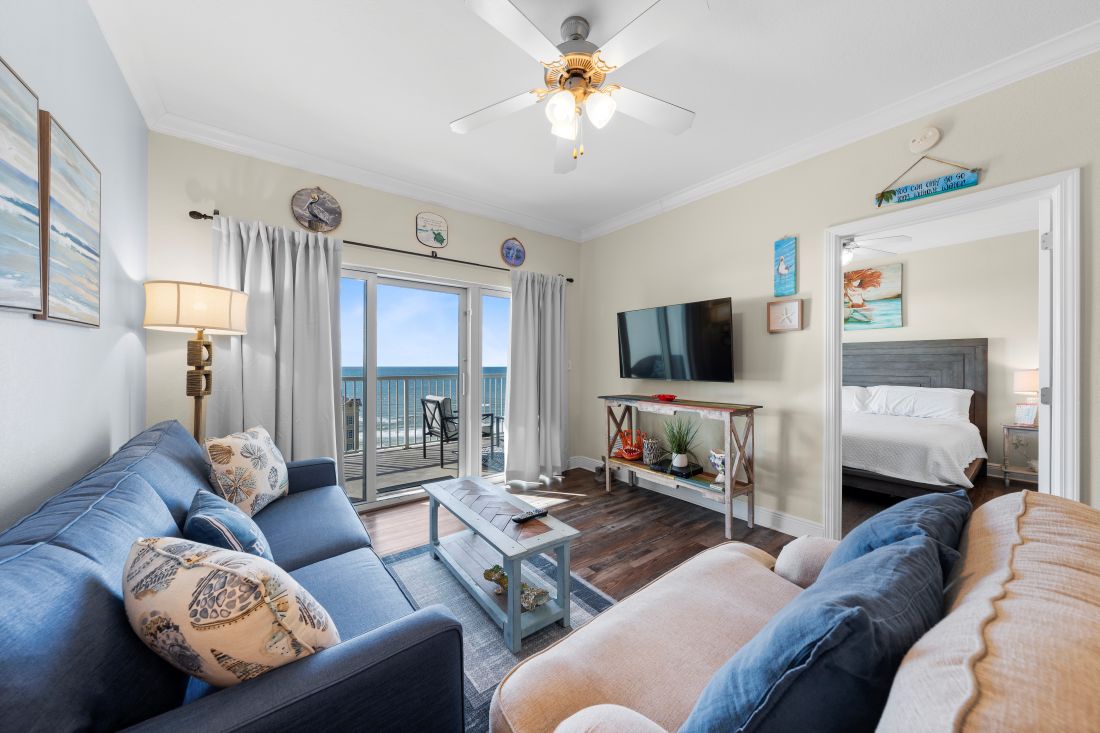 The living room in this 2-bedroom 2-bathroom condo brings all the beach vibes with its magnificent view from the private balcony. The open floor plan allows interaction while preparing family meals in the fully equipped New Orleans style kitchen. There is seating for 4 at the dining table and 2 people at the breakfast bar.
