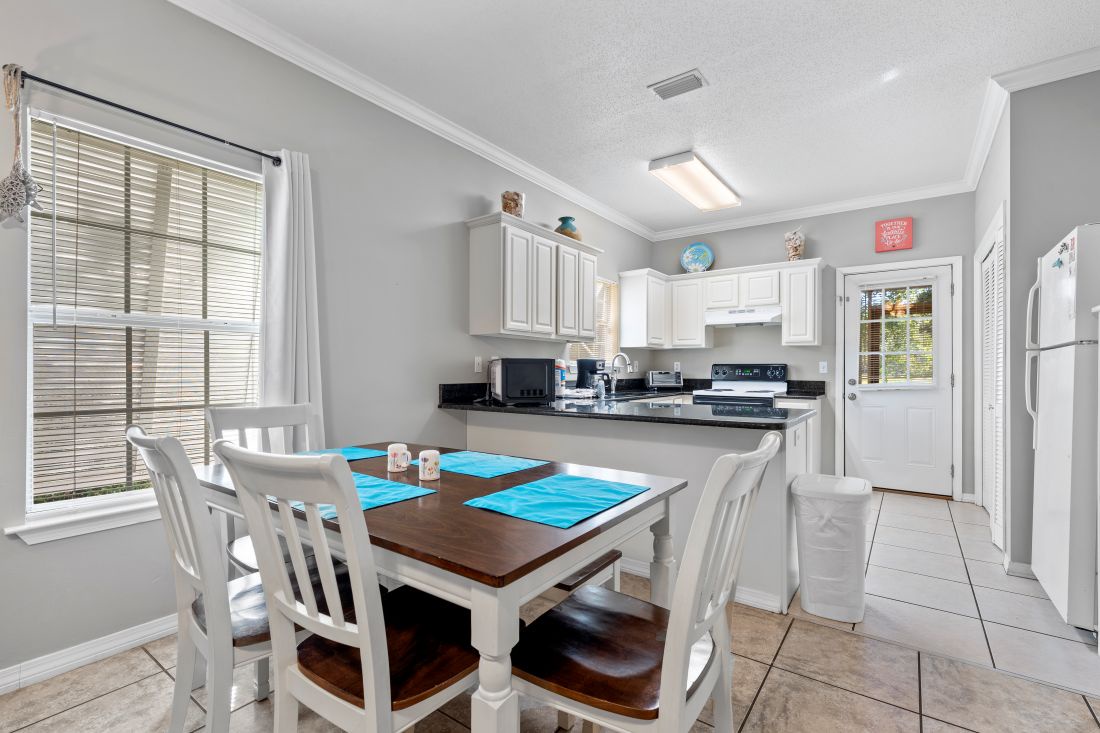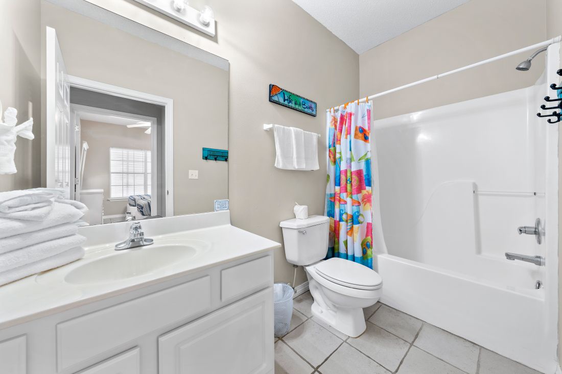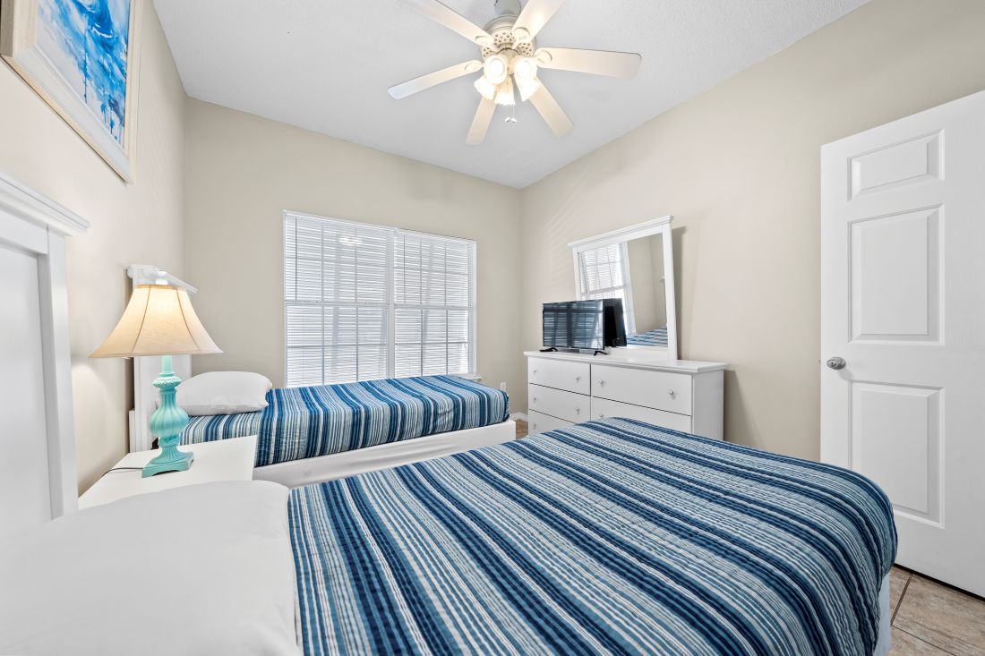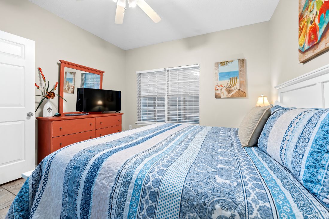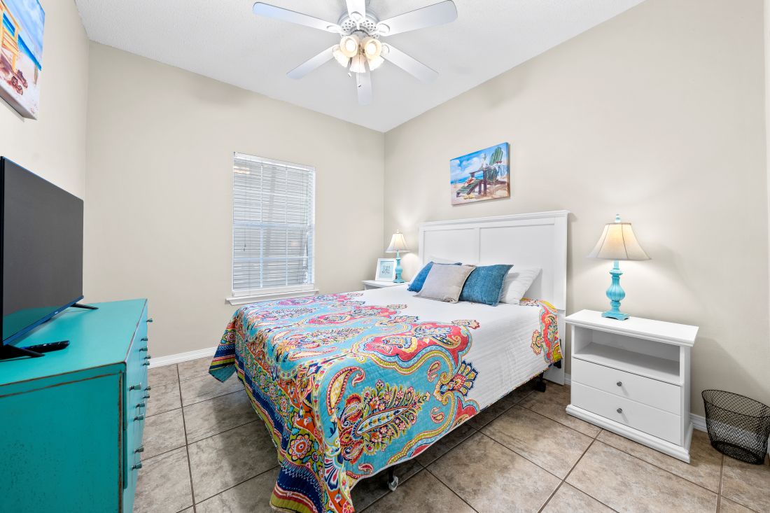 This tropical 3-bedroom 2-bathroom home features soothing coastal decor and all the comforts of home. The living room has a coastal contemporary feel and has a queen sleeper sofa and a large flat-screen television. The open kitchen is fully equipped and showcases granite countertops and full size appliances. The primary bedroom has a King size bed and a flat-screen television. The bathroom has an extended single sink vanity and a tub and shower combination. The first guest bedroom has a queen-sized bed and the third bedroom has two twin beds. All bedrooms feature flat-screen televisions. The full guest bathroom has a tub and shower combination. A full sized washer and dryer are conveniently located inside the house. Enjoy a peaceful afternoon sitting on the back patio around an outdoor table with four chairs.