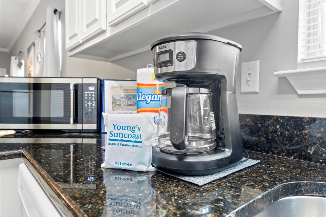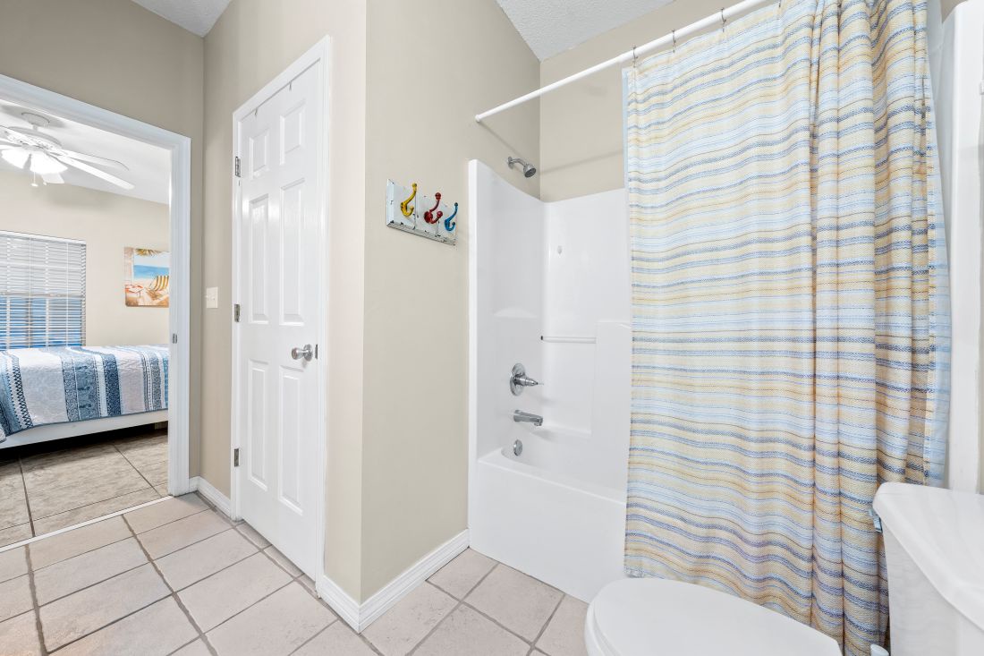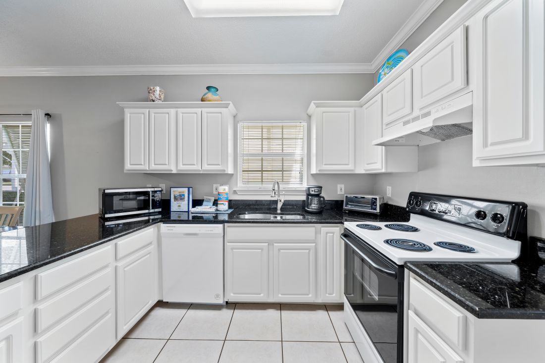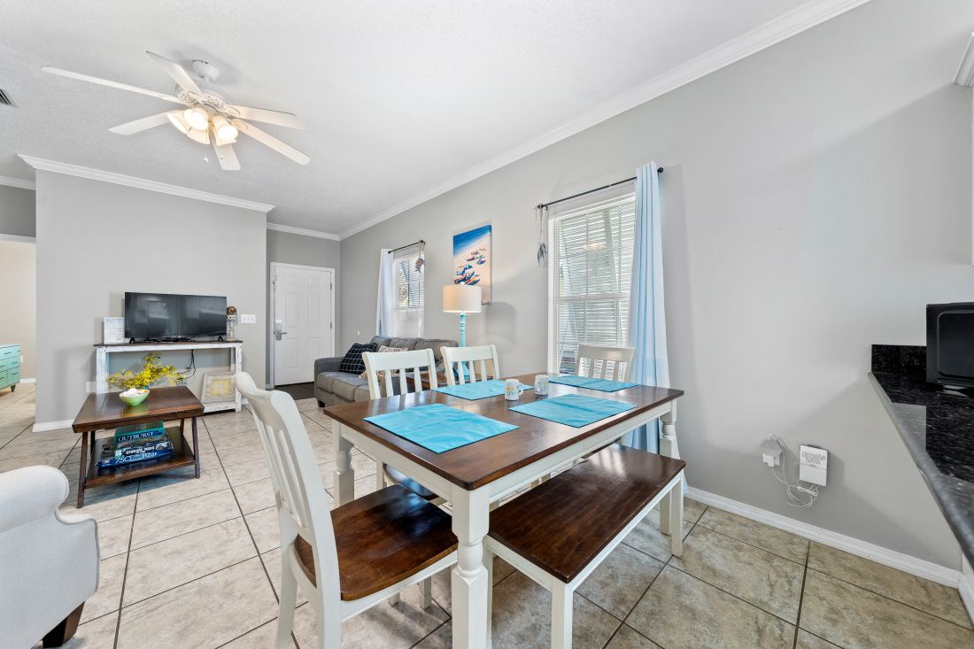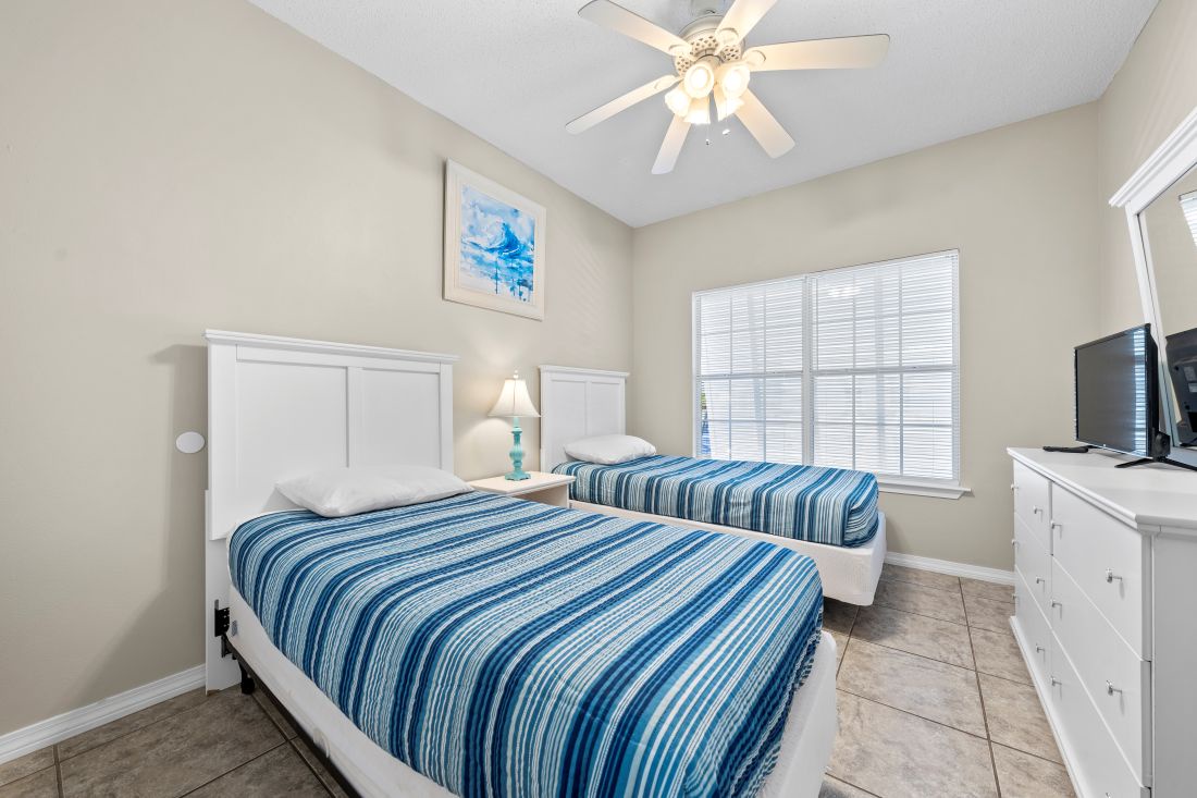 This tropical 3-bedroom 2-bathroom home features soothing coastal decor and all the comforts of home. The living room has a coastal contemporary feel and has a queen sleeper sofa and a large flat-screen television. The open kitchen is fully equipped and showcases granite countertops and full size appliances. The primary bedroom has a King size bed and a flat-screen television. The bathroom has an extended single sink vanity and a tub and shower combination. The first guest bedroom has a queen-sized bed and the third bedroom has two twin beds. All bedrooms feature flat-screen televisions. The full guest bathroom has a tub and shower combination. A full sized washer and dryer are conveniently located inside the house. Enjoy a peaceful afternoon sitting on the back patio around an outdoor table with four chairs.