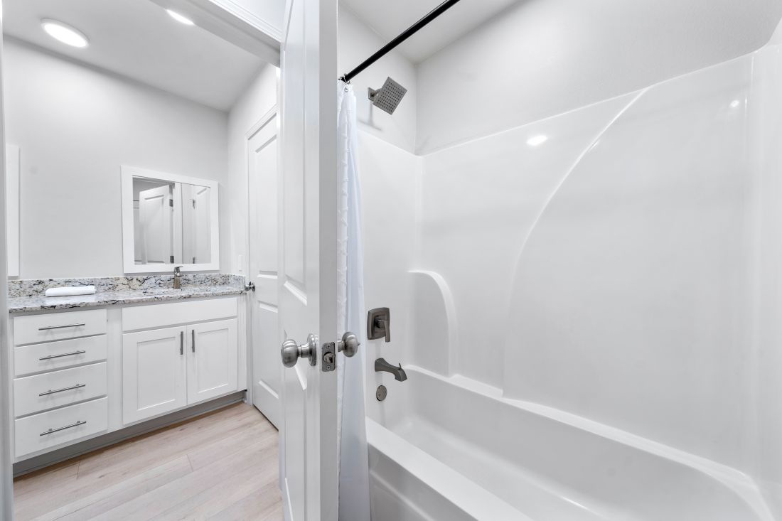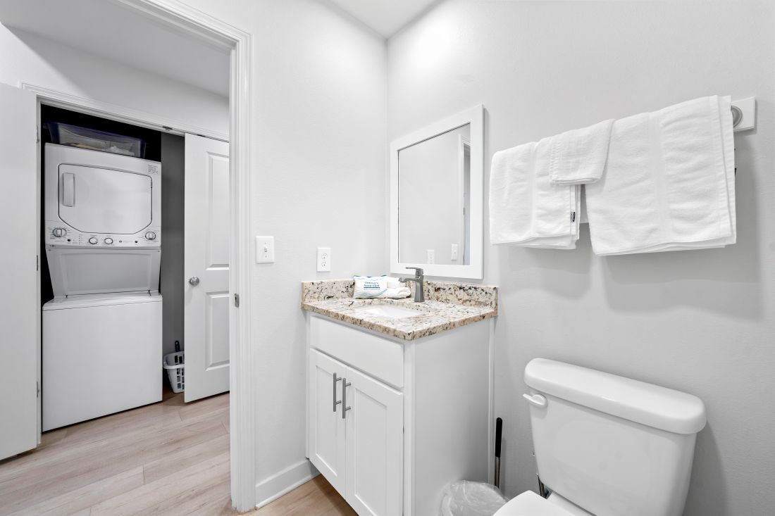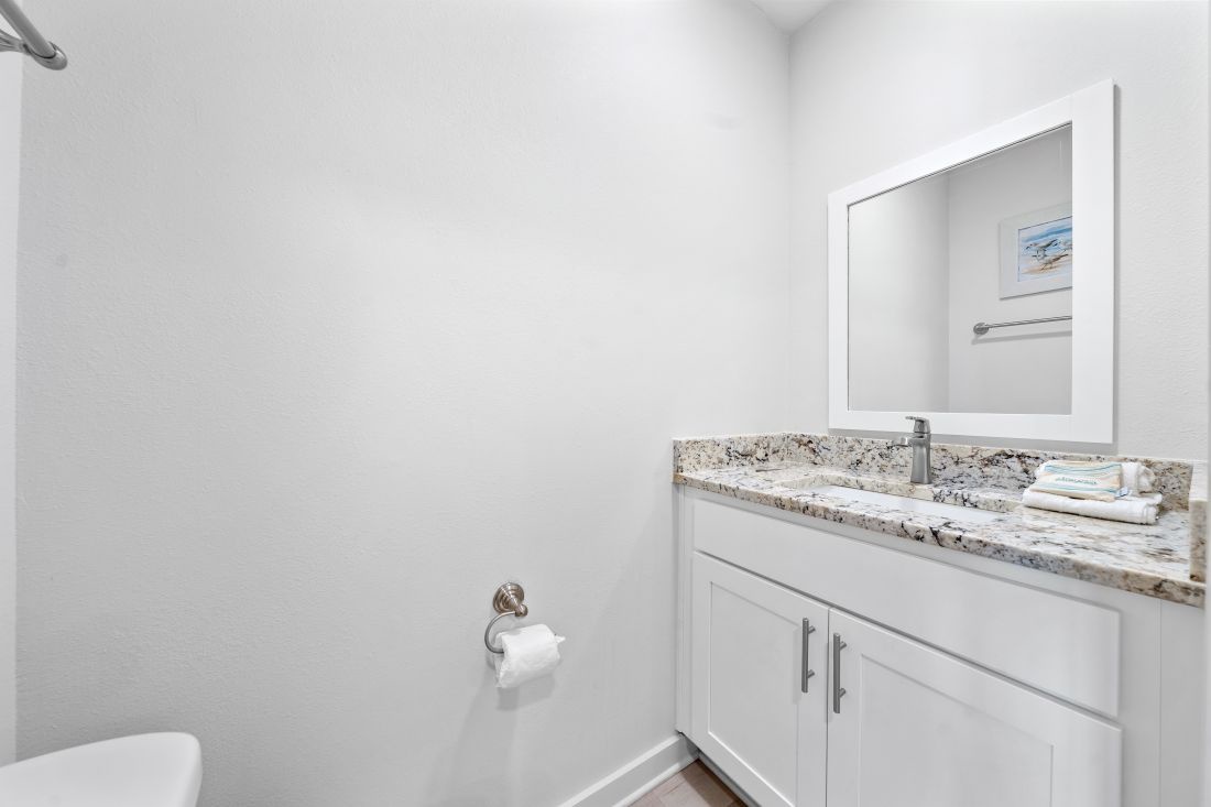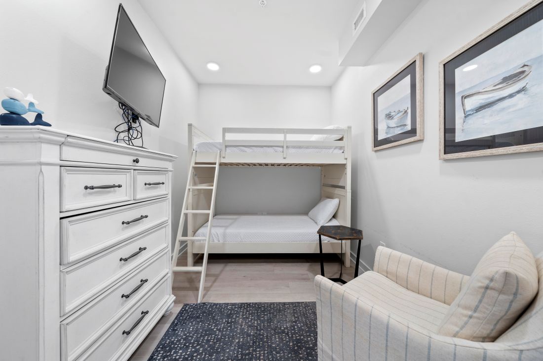 When it is time to relax after a busy day of getting your toes in the sand snuggle into the cozy king size bed. There is a flat screen television as well as plenty of storage space in the large dressers and closet. The vanity area attached to the bedroom has spacious granite counter space and dual sinks. The bathroom is shared and has a door leading to it from both the bedroom and the hallway. There is a tub-shower combination. When it is time to tuck the kids in bed you can read bedtime stories as they are nestled into the bunks in the second bedroom. There is a television in case they want to watch cartoons and sliding doors for privacy. Sea Glass 404 can sleep up to 6 people comfortably.