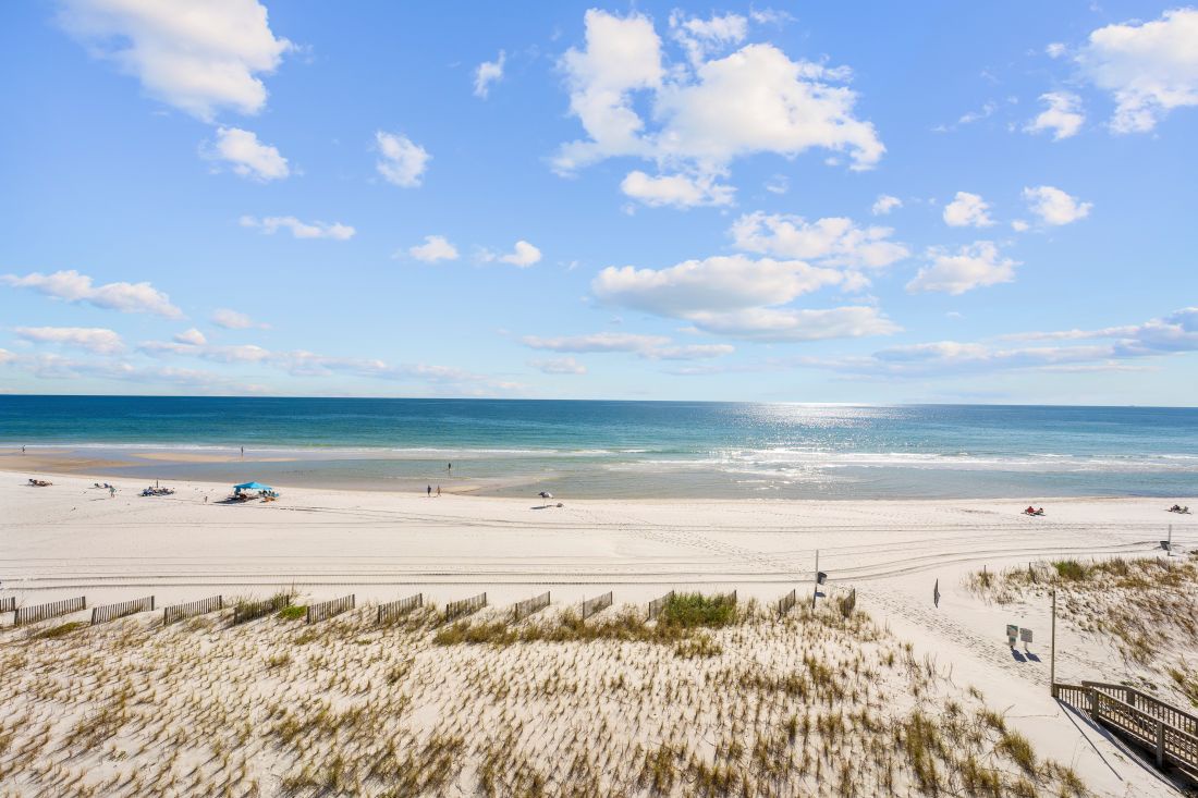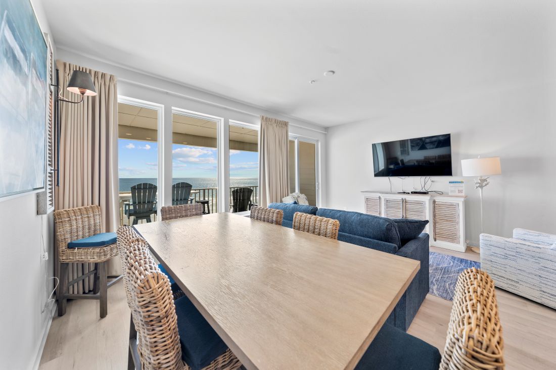 Experience a Gulf Shores beach vacation in coastal elegance. Sea Glass 404 provides everything you need to make your beach dreams a reality. This 2-bedroom 1.5-bathroom condo is in the heart of it all and has all the comforts of home. When you step inside you will quickly see no detail has been overlooked. The open floor plan allows plenty of space for the family to spend quality time together. You will find cool tones of blue throughout the beautifully furnished living room. There is even a queen size sofa sleeper in case you need more sleeping space. The living room has a large wall mounted television where you can watch your favorite shows. You can even prop open the door leading to the spacious gulf-facing balcony to let in the cool Alabama breeze. When you step onto the balcony you are close enough to see the dolphins splashing and playing in the waves.