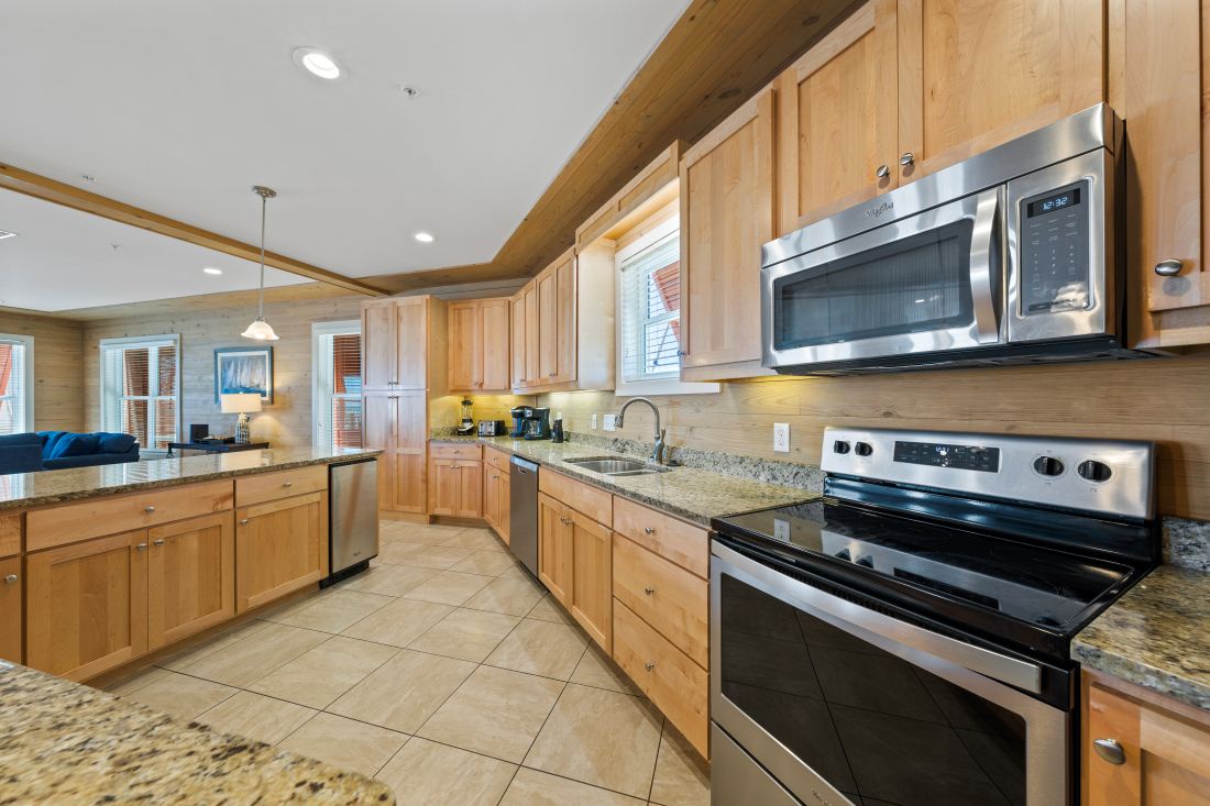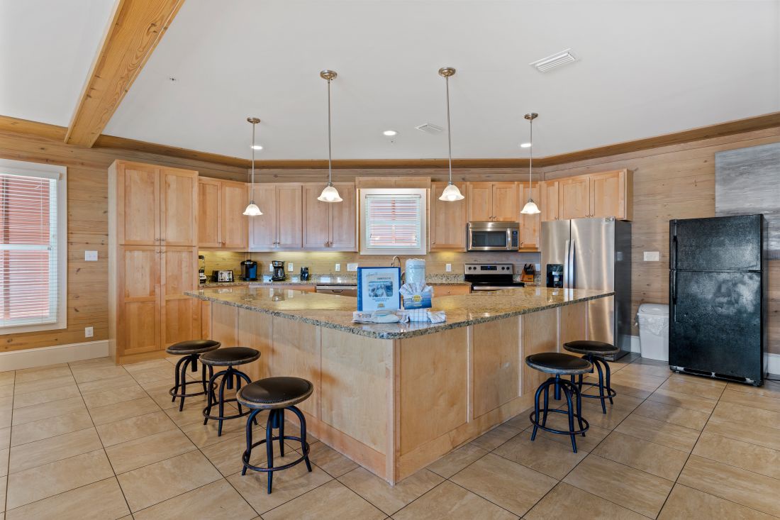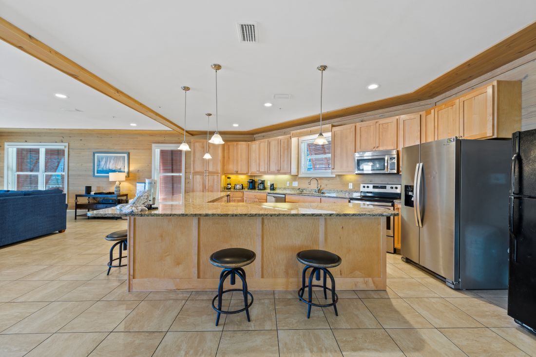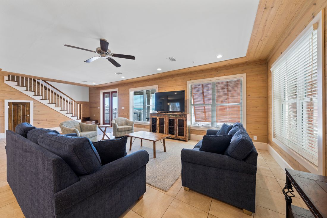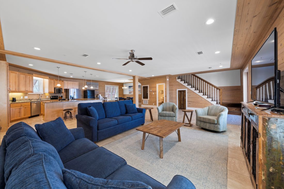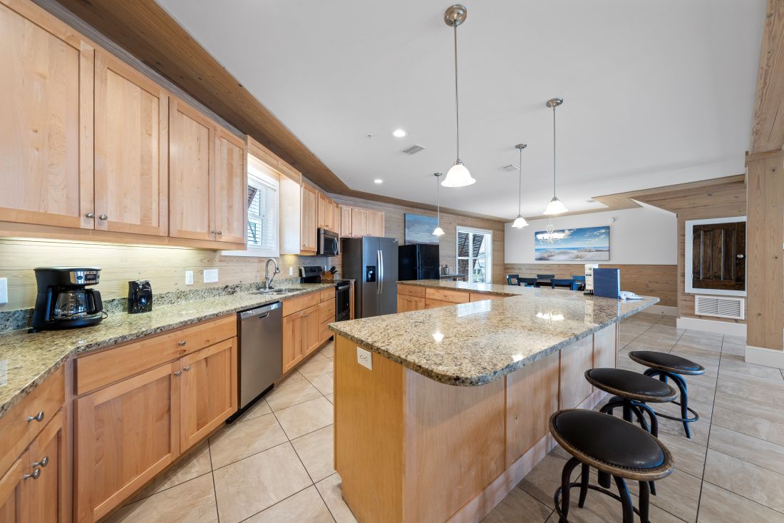 The cool and calm beach inspired decor and natural wood elements flow throughout the house. The well-appointed style and open floor plan of the main level includes the living kitchen and dining areas so your group can easily socialize. You will find a spacious living room with a 50-inch HDTV complete with a queen sleeper sofa another full sofa and 2 oversized comfortable chairs with ottomans. Adjacent is the enormous open kitchen with stainless steel appliances granite countertops freestanding ice maker and a counter height seating for 8. The dining area has a large table that seats 8 comfortably and is perfect for family meals and catching up on the day's activities.