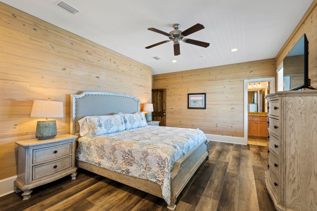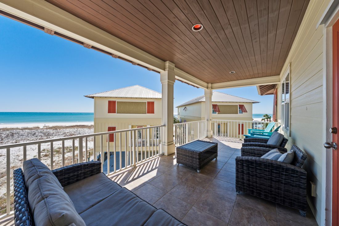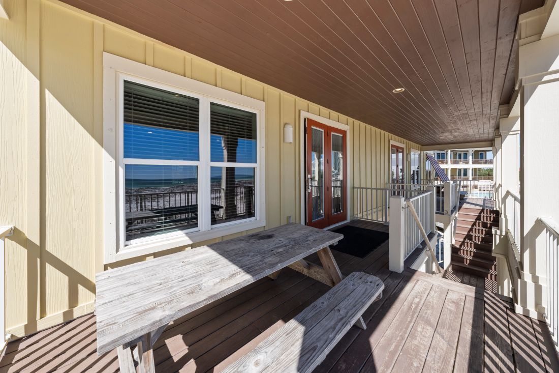 For your convenience a half bath is also located on the main level. All bedrooms are located on the second level and the full width balcony can be accessed through the hall making it easy for all guests to enjoy the gulf view. A banister separates the two sides of the duplex. The primary suite faces the Gulf and offers a beautiful view of the white sandy beaches. Guests staying in the primary bedroom will have a king bed private bath flat screen TV and Blu-Ray player. Next you have the bunk room where you will find 8 built in traditional twin size bunk beds. The bunk room comes with a flat screen TV and Blu-Ray to keep the children entertained. Just across the hall from the bunk room is a full size bathroom. The final two bedrooms also come equipped with TVs and Blu-Ray players where guests can retreat to their private space and relax. One has a King bed and the other has a Queen and they share a Jack and Jill bathroom.