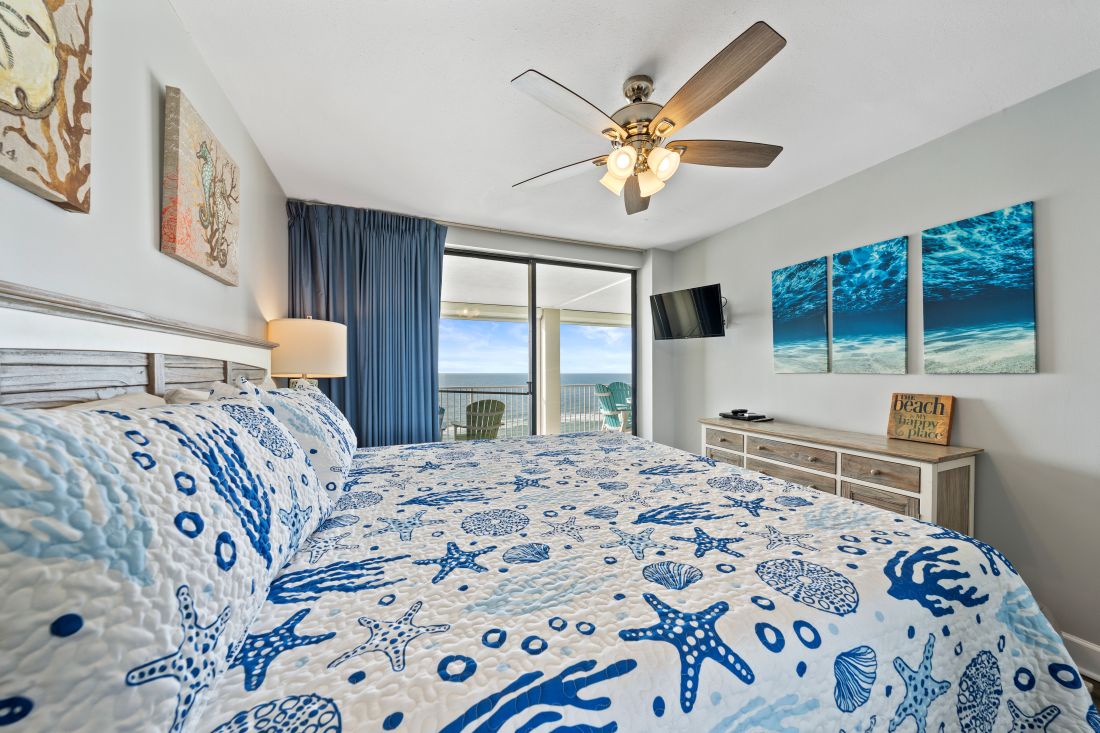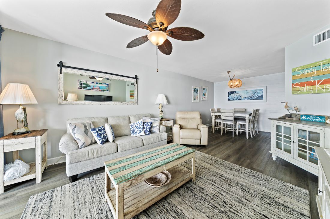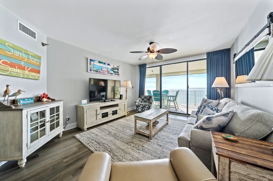The spacious and inviting living room is the perfect spot to make memories. You can gaze out the floor to ceiling sliding doors which lead to the balcony overlooking the sugar white sand or watch television on the 65 inch, smart TV. The couch pulls out to a queen size bed in case there is need for more sleeping space.