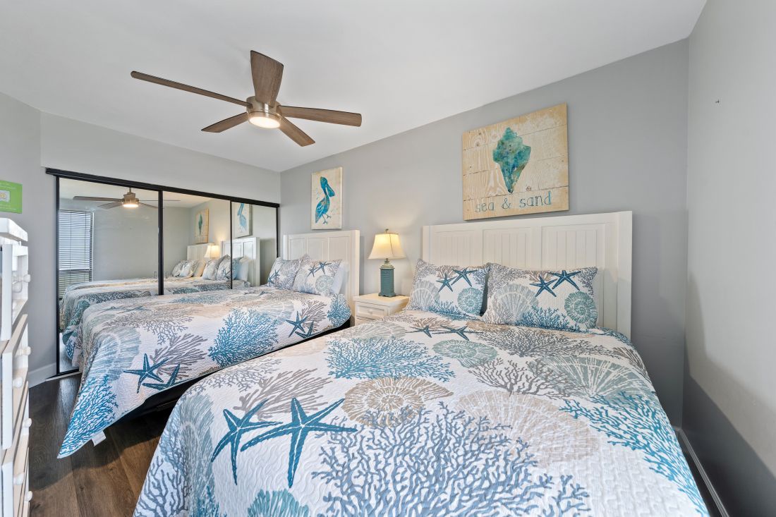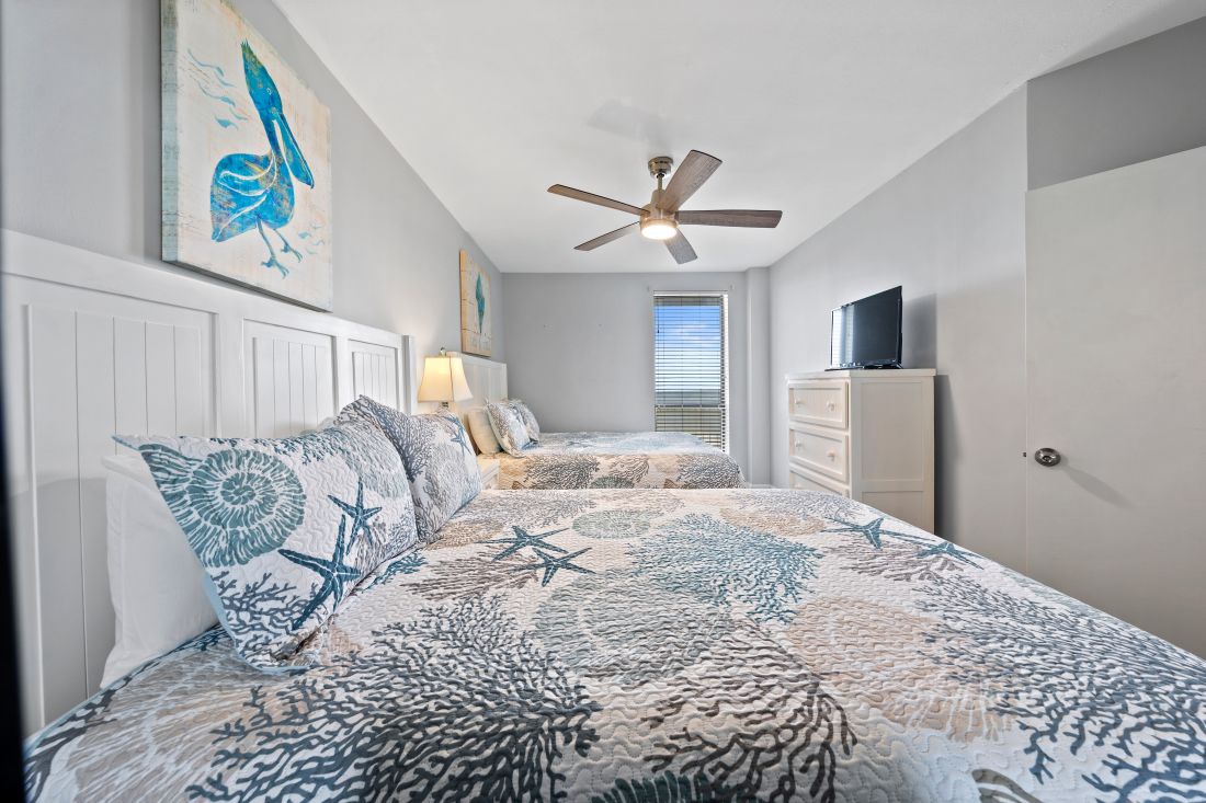 The second bedroom has two queen beds and the third bedroom has a single queen bed. The second bathroom has a bathtub and shower combination. There is plenty of space for everyone to get ready for a night on the town or a day at the beach.