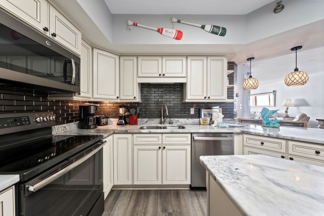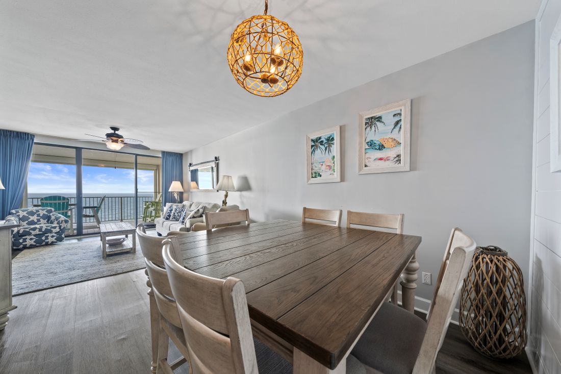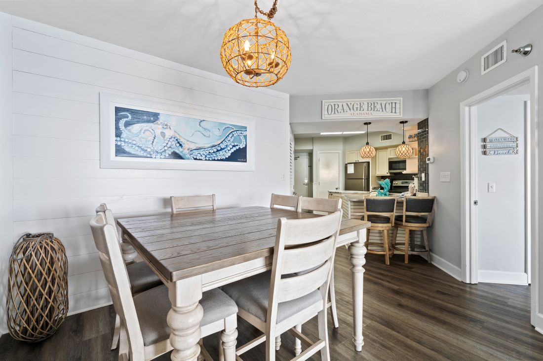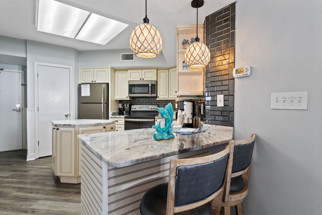 In the kitchen you will find all you need to create culinary magic. Stainless steel, and updated appliances make preparing a fresh caught seafood meal a breeze. There is a dining table that seats 6 and 2 stools at the counter space, or you can dine on the private beach front balcony.