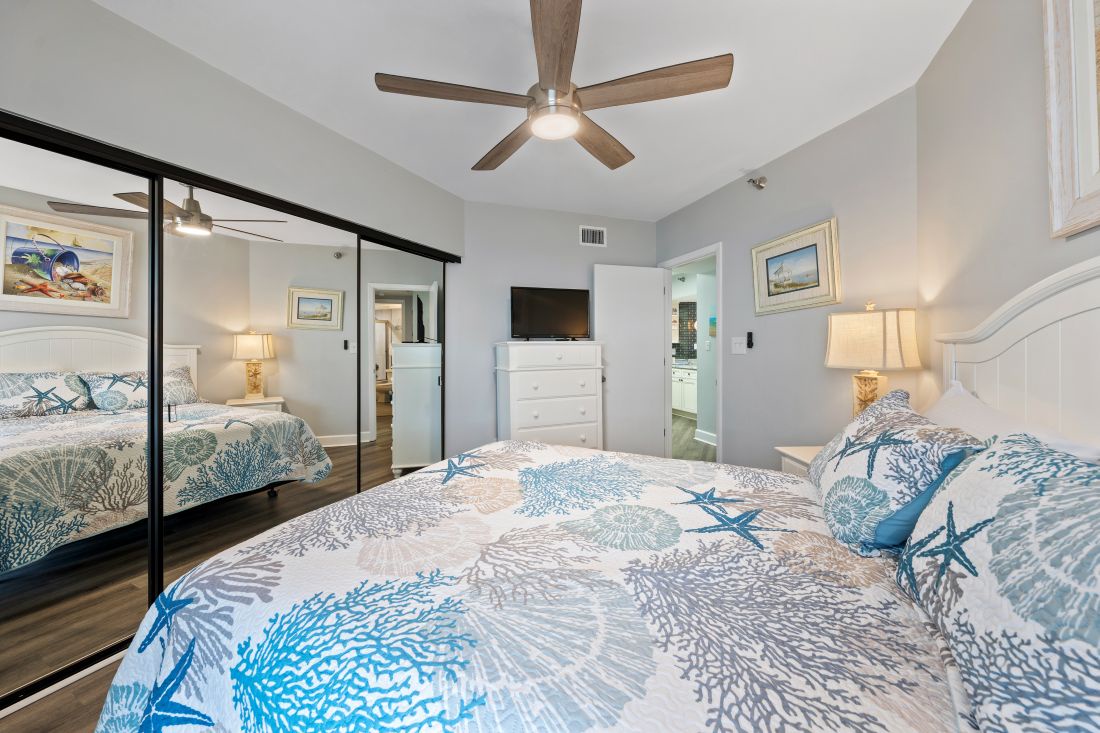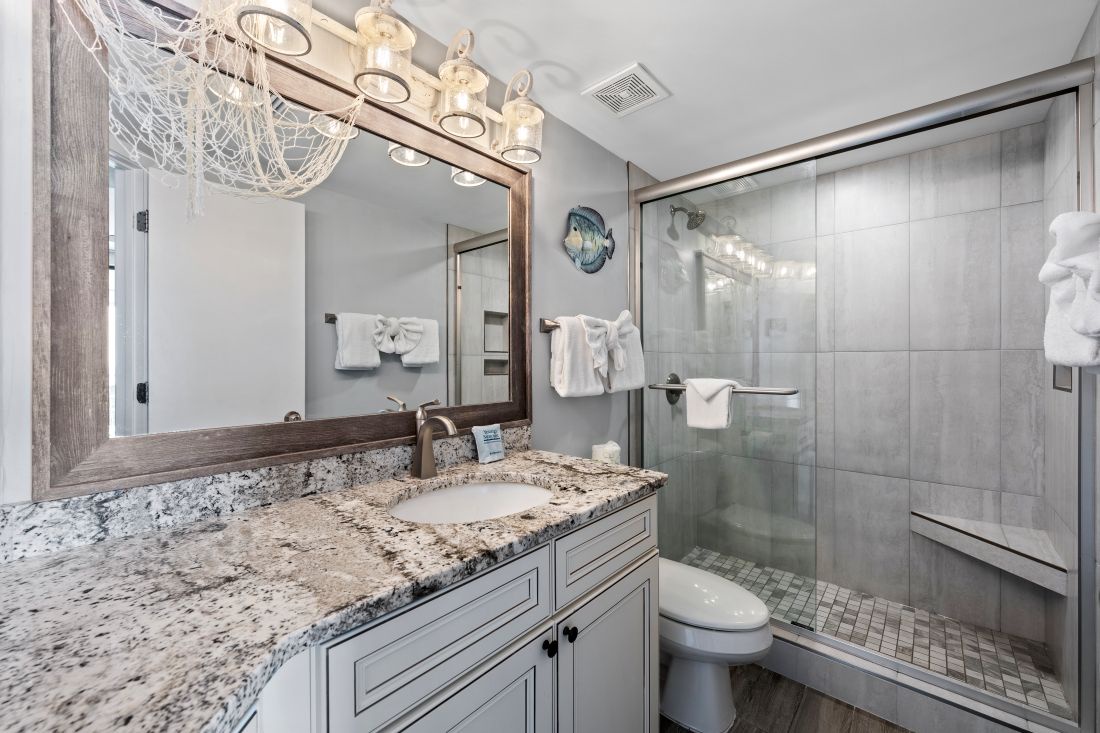 After a day of splashing in the crystal-clear water or exploring all the things to do in Orange Beach, the king size bed in the primary bedroom will be ready and waiting for you. Drift off to sleep in style, or just lay down and relax while watching your favorite movie or taking in the sites outside the balcony door. The primary bathroom has a tiled, walk-in shower.